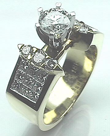 A stunning invisible setting with 3 rows of brilliant princess cut diamonds. An additional row brings the total carat weight to 1ct. Centered is a quality 3/4ct round brilliant. Amazingly brilliant!