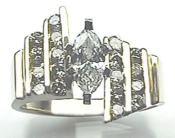 Straight channels of round diamonds offset to show a quality 1/2ct marquis center diamond. A savy style of a classic design. 1ct of shinning diamonds is sure to put a sparkle in her eye!