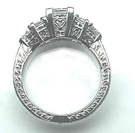 Beautifully sculptured ring in solid platinum boasts a 1ct princess center diamond EGL certified H color, SI1 or better. Flowing down are 2/3cttw in matching emerald cuts and trillians. The band is thoroughly engraved. Under each diamond is a special filigreed design giving this ring an antique feel. A ring to cherish forever!