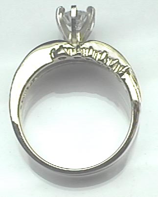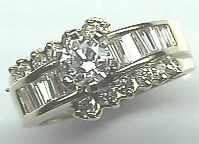 Stacked baguettes in channels are bordered by round individually prong set diamonds. Shimmer and shine make this quality 1/2ct round diamond stand out. A simple and impressive design sure to turn heads!