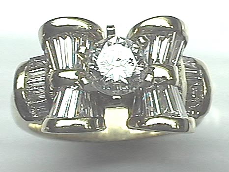 A yellow gold ring of geometric inspiration! Beautiful baguette diamonds bearing classic curves and bold radiance of 1.5cts. A quality 1ct round diamond makes the total 2.5cts of shimmering diamonds! Imagine the look on her face as she opens the box and is taken back by seer radiance!